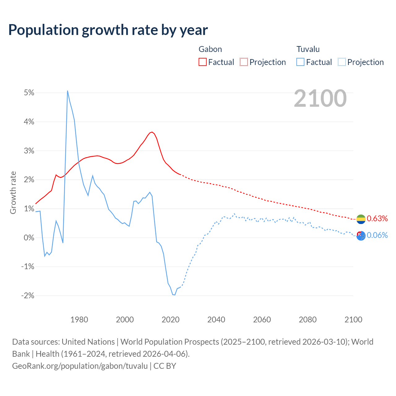- For the last 10 years, Gabon has had an average growth rate of +2.61% per year vs -1.19% in Tuvalu.