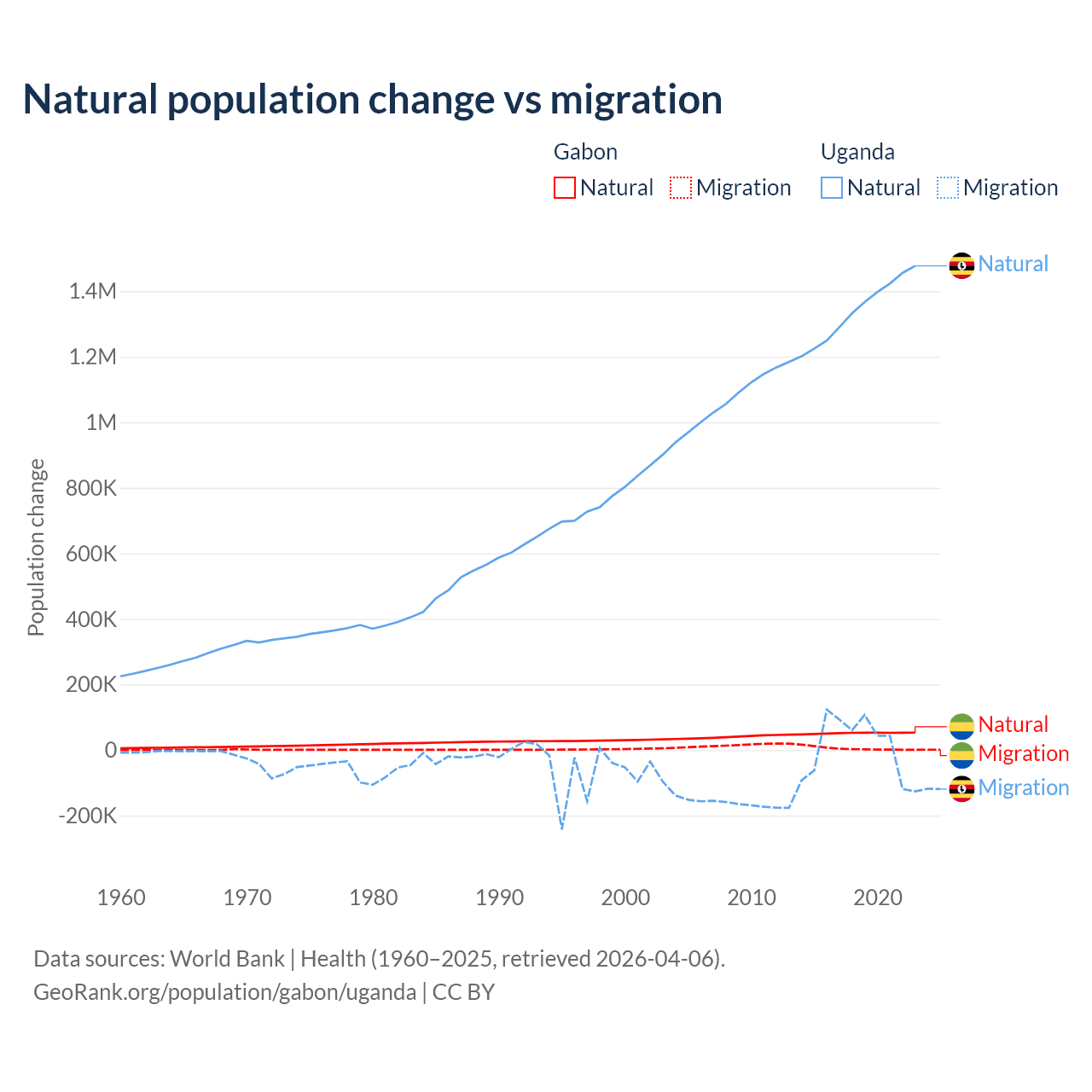 Over the last 10 years, 91.1% of the population change in Gabon is from natural causes (a gain of 515,484 people) and 8.86% is from migration (a gain of 50,119 people). In Uganda 99.5% is from natural causes (a gain of 13,419,712 people) and 0.53% is from migration (a gain of 71,457 people).