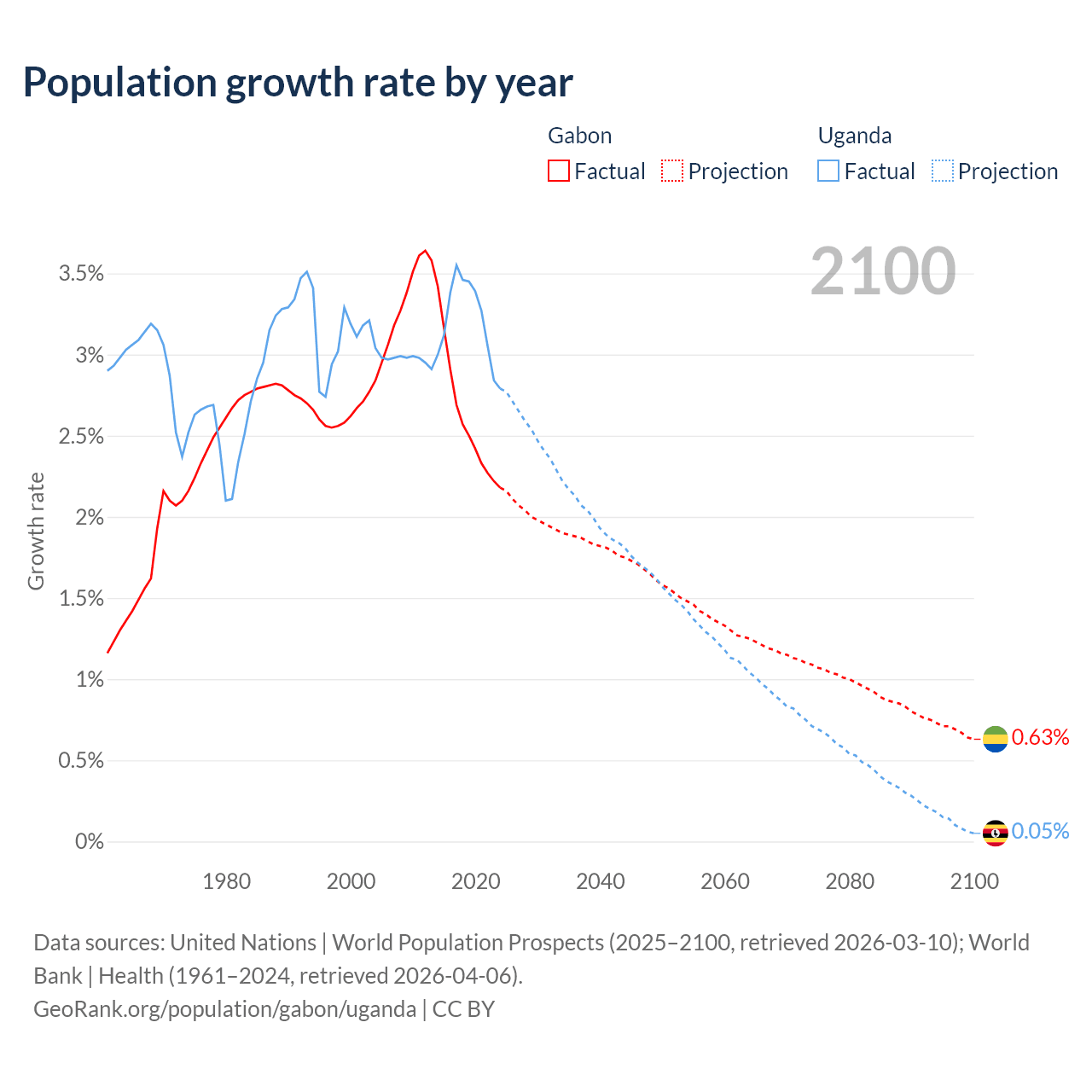 - For the last 10 years, Gabon has had an average growth rate of +2.61% per year vs +3.21% in Uganda.