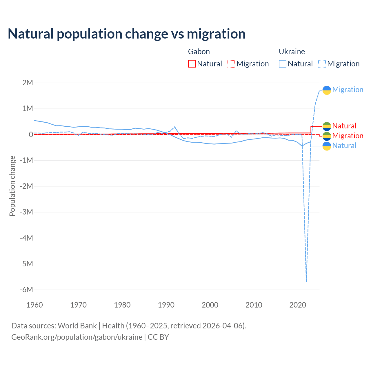 Over the last 10 years, 91.1% of the population change in Gabon is from natural causes (a gain of 515,484 people) and 8.86% is from migration (a gain of 50,119 people). In Ukraine 28.2% is from natural causes (a loss of 2,435,153 people) and 71.8% is from migration (a loss of 6,198,995 people).