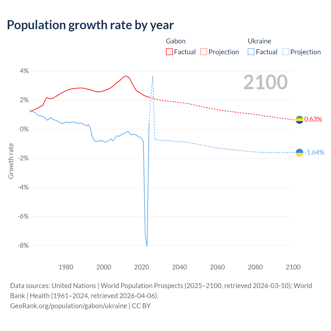 - For the last 10 years, Gabon has had an average growth rate of +2.61% per year vs -1.74% in Ukraine.