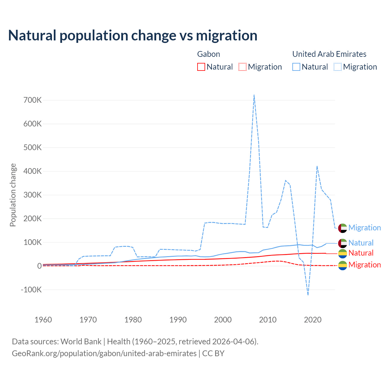 Over the last 10 years, 91.1% of the population change in Gabon is from natural causes (a gain of 515,484 people) and 8.86% is from migration (a gain of 50,119 people). In the United Arab Emirates 30.5% is from natural causes (a gain of 857,996 people) and 69.5% is from migration (a gain of 1,958,520 people).