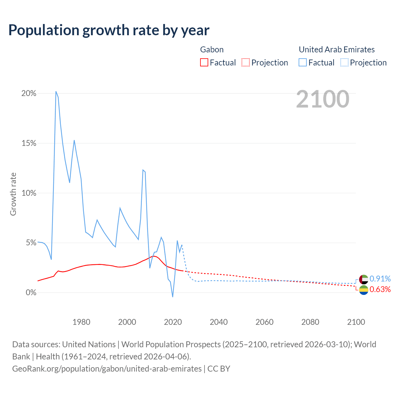 - For the last 10 years, Gabon has had an average growth rate of +2.61% per year vs +3.31% in the United Arab Emirates.
