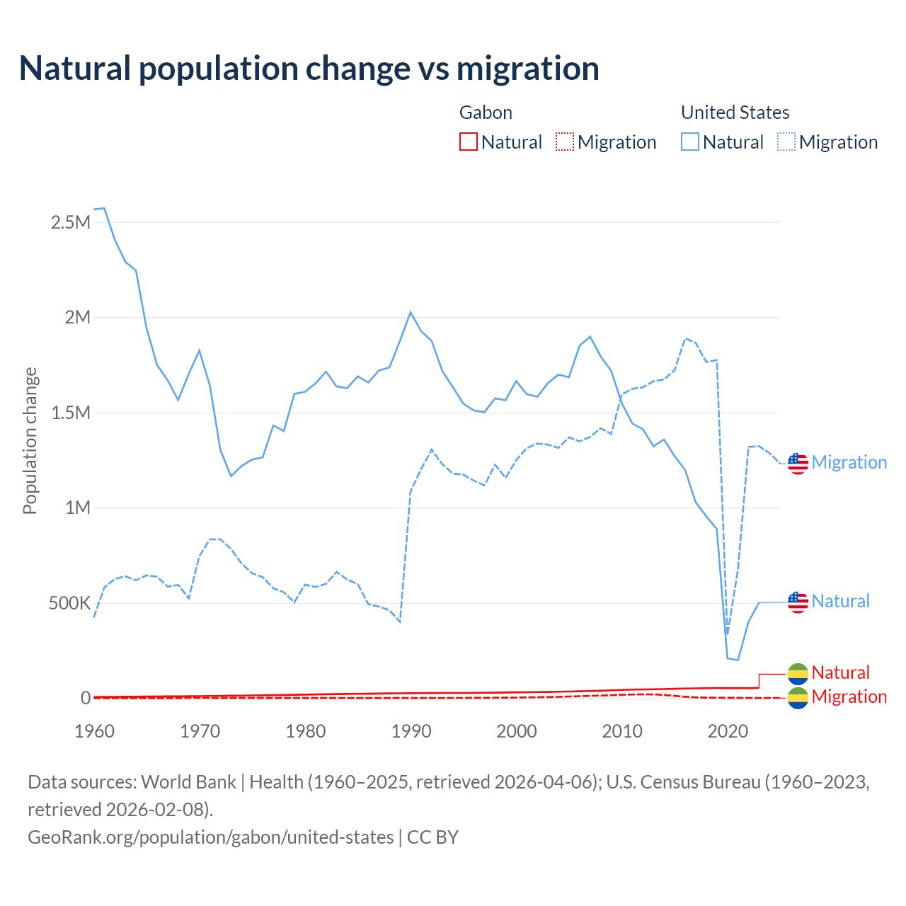 Over the last 10 years, 91.1% of the population change in Gabon is from natural causes (a gain of 515,484 people) and 8.86% is from migration (a gain of 50,119 people). In the United States 35.8% is from natural causes (a gain of 8,005,866 people) and 64.2% is from migration (a gain of 14,334,286 people).