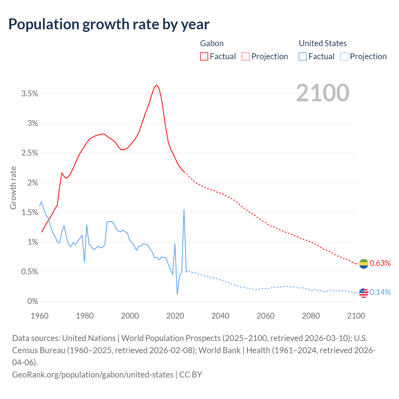 - For the last 10 years, Gabon has had an average growth rate of +2.61% per year vs +0.65% in the United States.