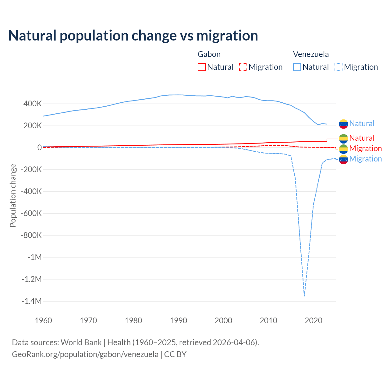 Over the last 10 years, 91.1% of the population change in Gabon is from natural causes (a gain of 515,484 people) and 8.86% is from migration (a gain of 50,119 people). In Venezuela 38.6% is from natural causes (a gain of 2,946,257 people) and 61.4% is from migration (a loss of 4,683,227 people).