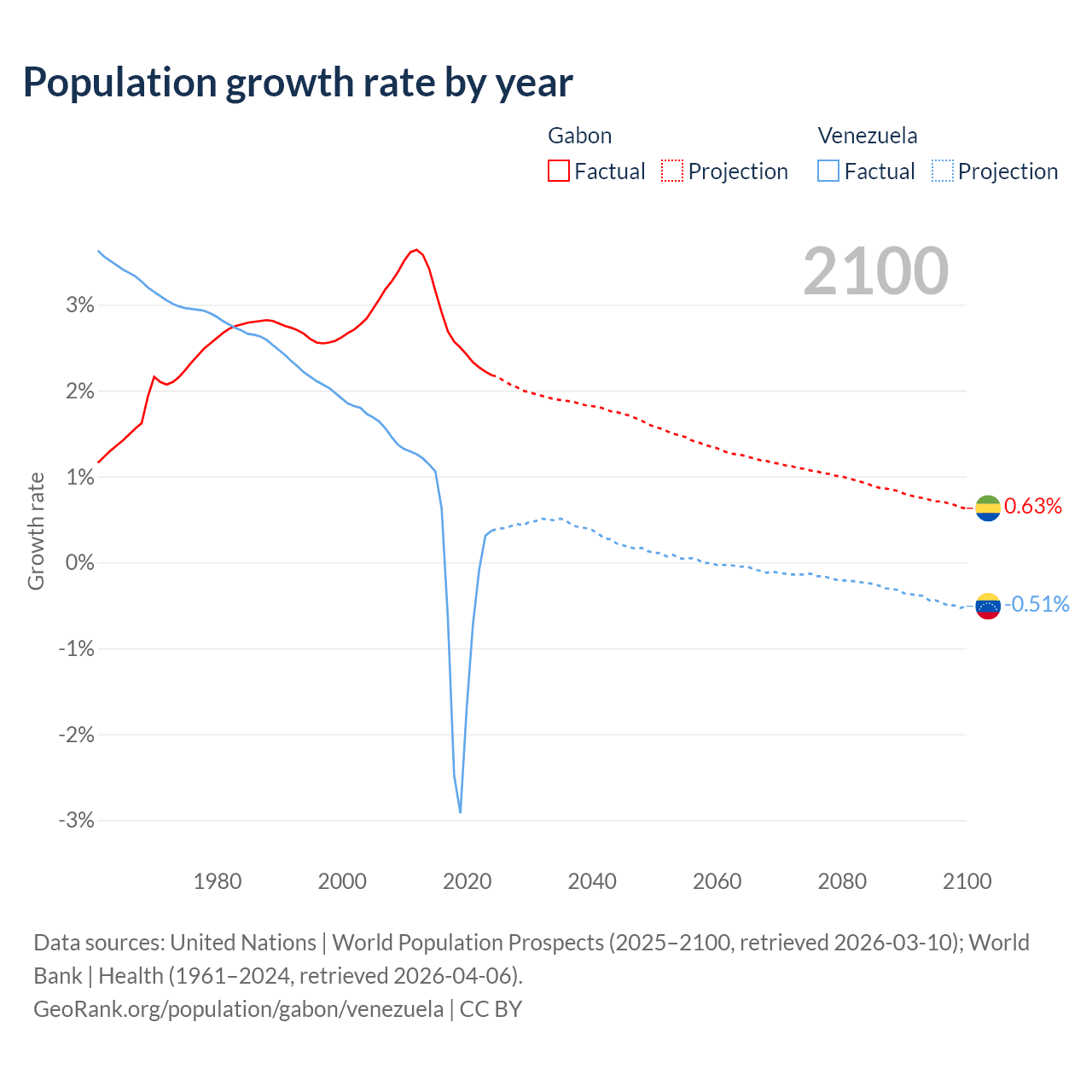 - For the last 10 years, Gabon has had an average growth rate of +2.61% per year vs -0.46% in Venezuela.