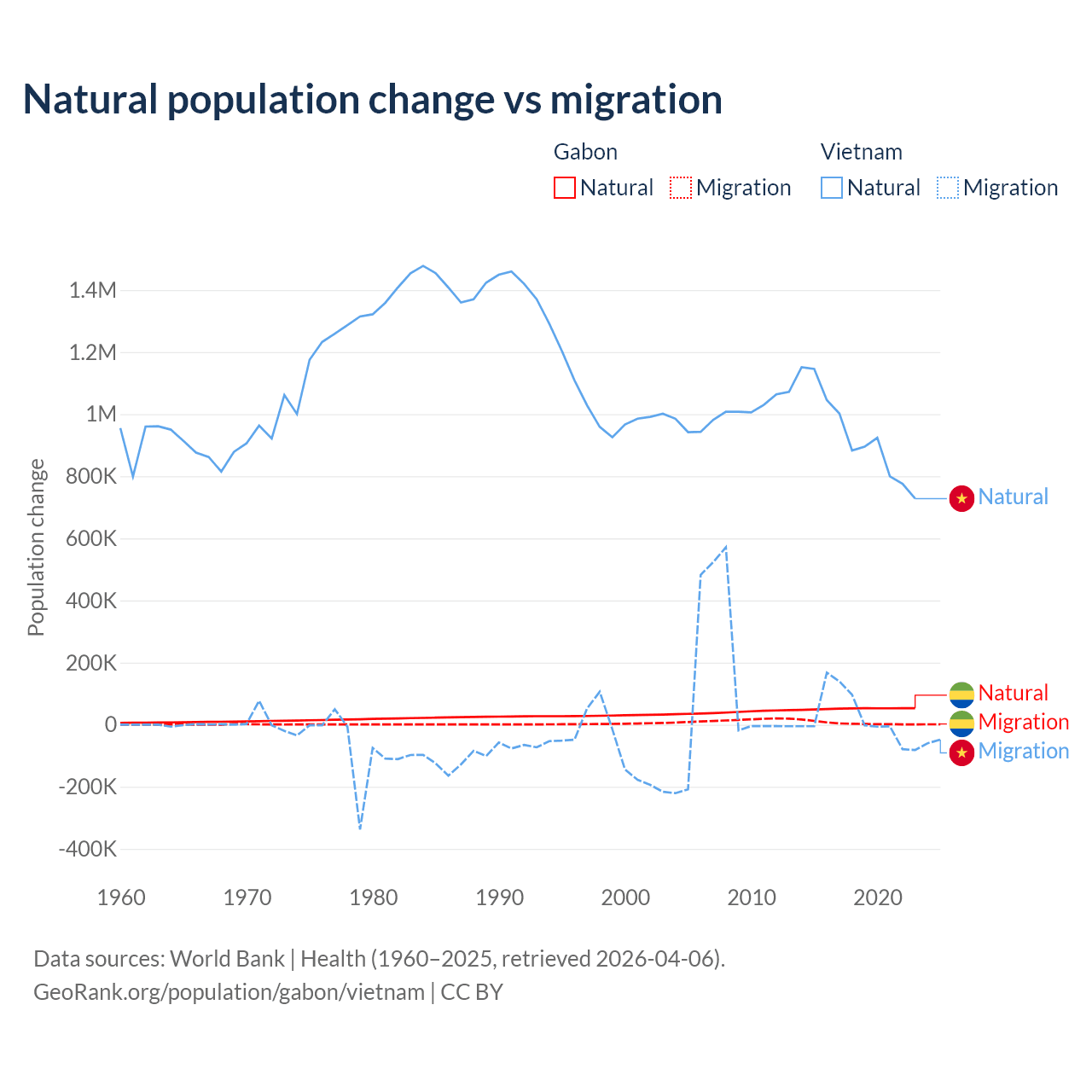 Over the last 10 years, 91.1% of the population change in Gabon is from natural causes (a gain of 515,484 people) and 8.86% is from migration (a gain of 50,119 people). In Vietnam 97.7% is from natural causes (a gain of 9,349,756 people) and 2.29% is from migration (a gain of 219,073 people).