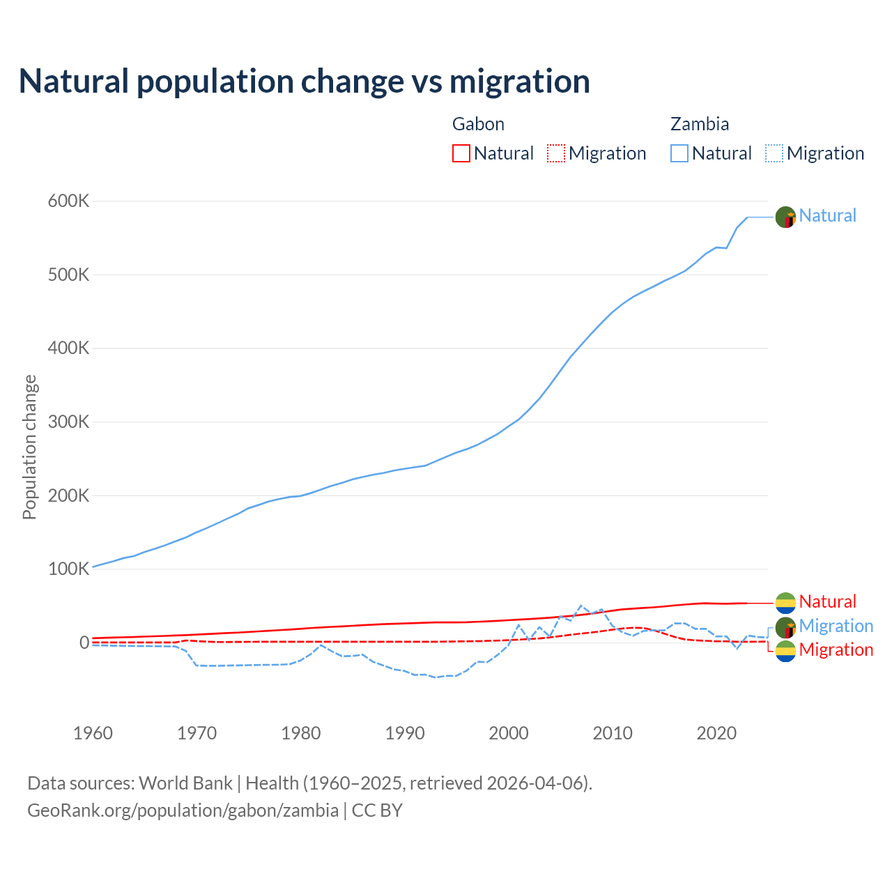 Over the last 10 years, 91.1% of the population change in Gabon is from natural causes (a gain of 515,484 people) and 8.86% is from migration (a gain of 50,119 people). In Zambia 97.4% is from natural causes (a gain of 5,233,797 people) and 2.58% is from migration (a gain of 138,554 people).