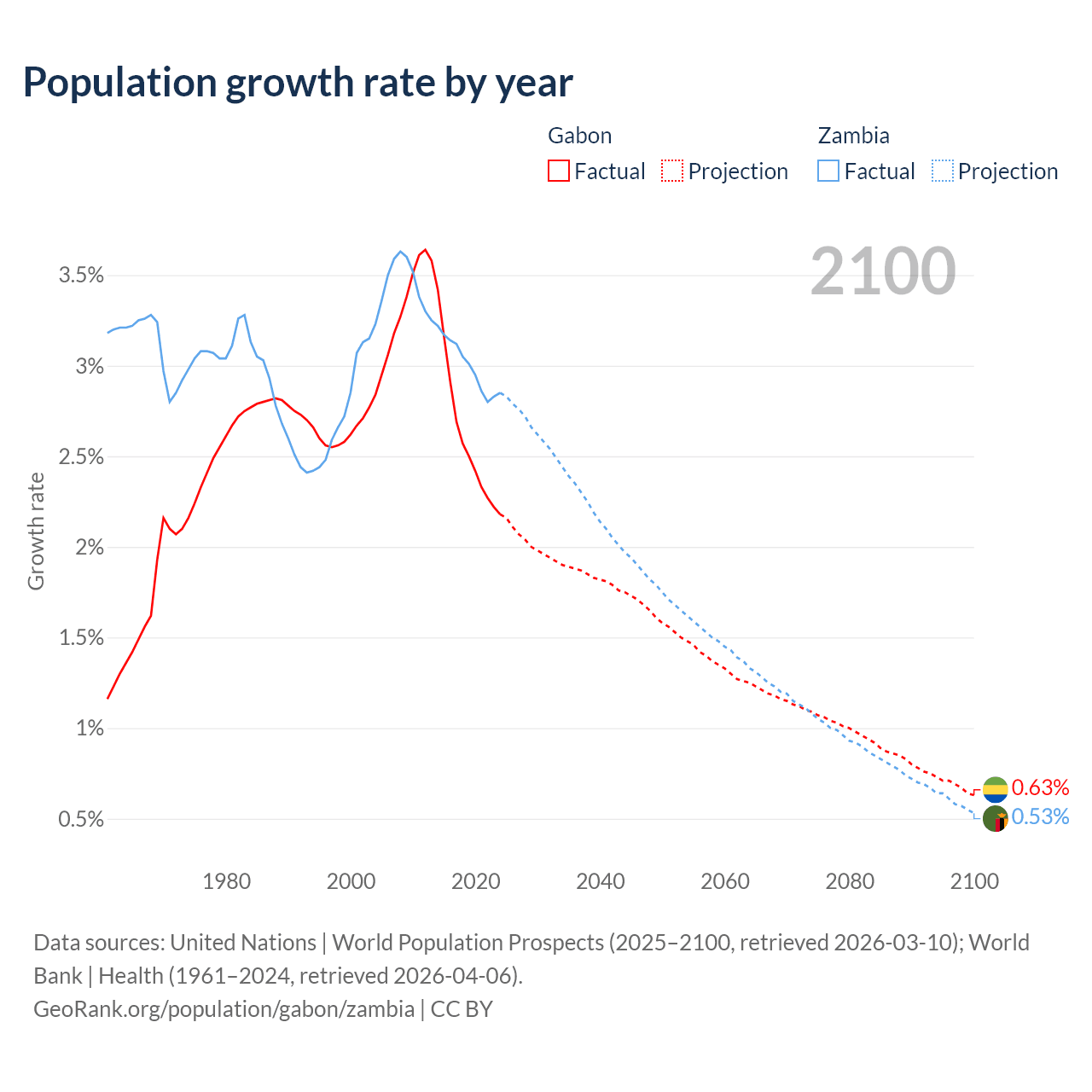 - For the last 10 years, Gabon has had an average growth rate of +2.61% per year vs +3% in Zambia.