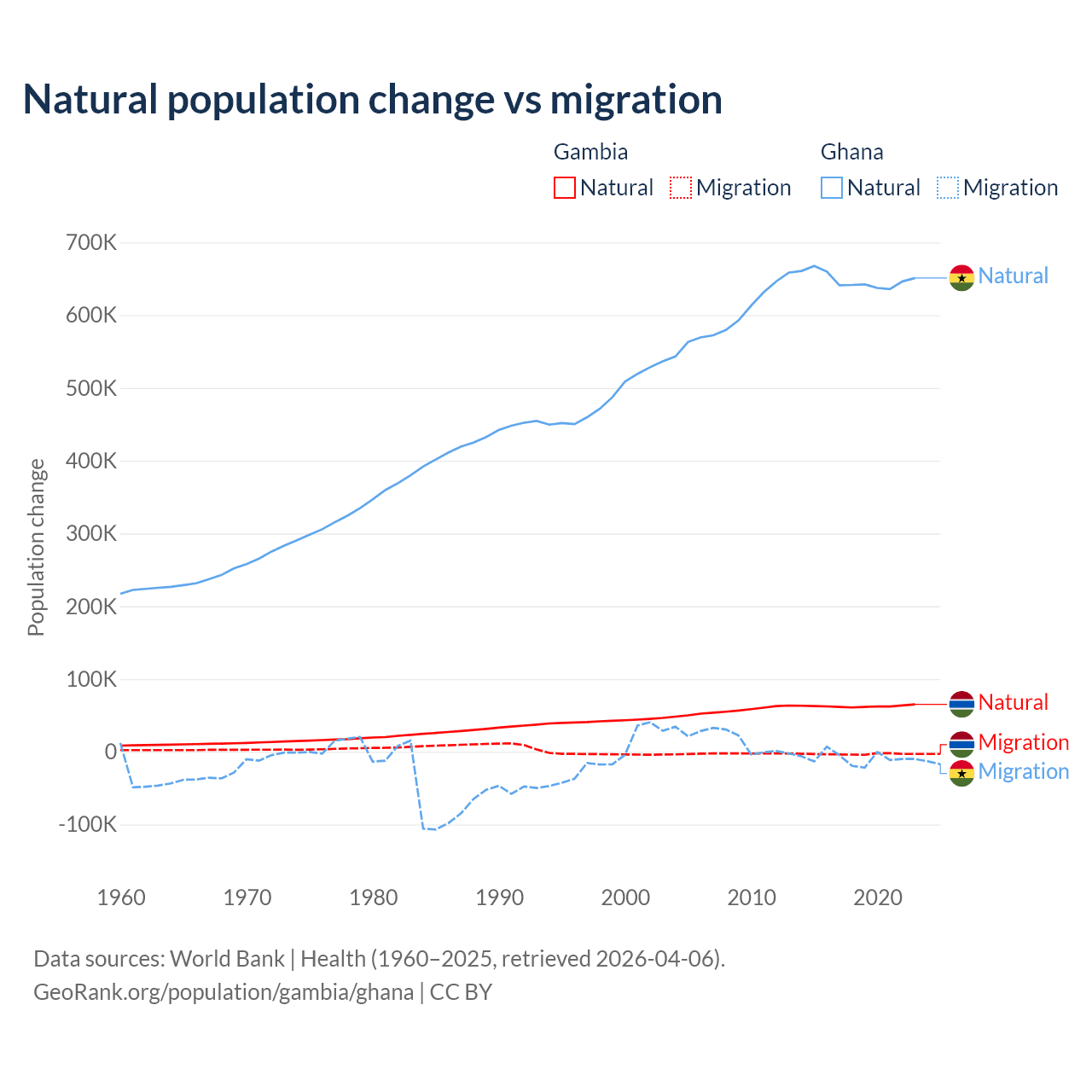 Over the last 10 years, 95.2% of the population change in the Gambia is from natural causes (a gain of 625,795 people) and 4.75% is from migration (a loss of 31,227 people). In Ghana 98.6% is from natural causes (a gain of 6,484,449 people) and 1.37% is from migration (a loss of 90,310 people).