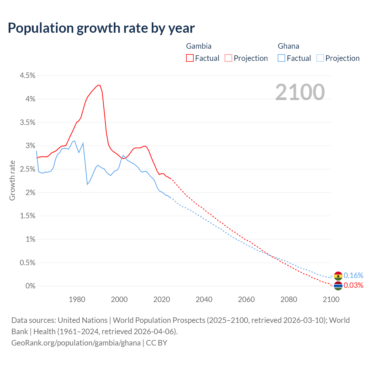 - For the last 10 years, the Gambia has had an average growth rate of +2.5% per year vs +2.1% in Ghana.