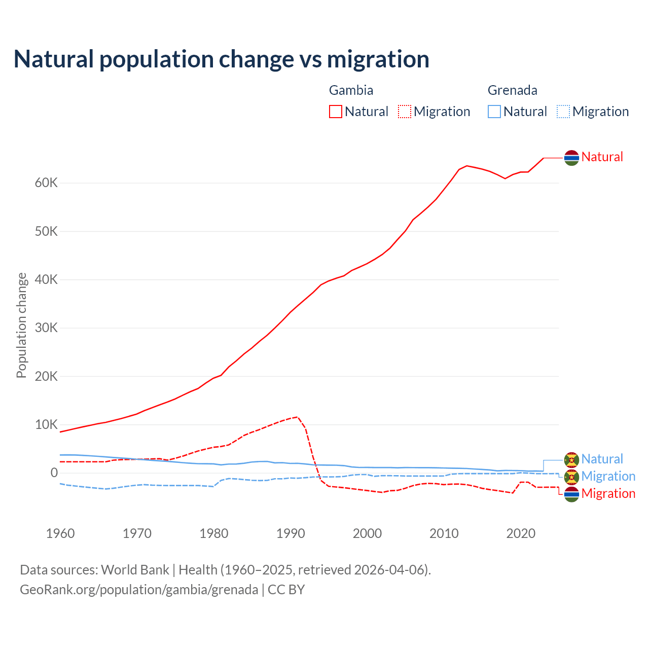 Over the last 10 years, 95.2% of the population change in the Gambia is from natural causes (a gain of 625,795 people) and 4.75% is from migration (a loss of 31,227 people). In Grenada 76% is from natural causes (a gain of 4,850 people) and 24% is from migration (a loss of 1,535 people).