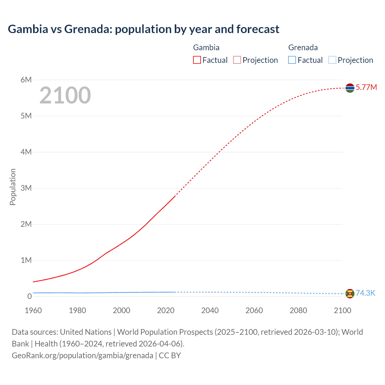 The latest officially reported population of the Gambia was 2,759,988 in 2024 vs 117,207 people in Grenada in 2024. In 2026, based on the adjusted UN estimation, the current Gambia's population is 2,902,554 people compared to 117,407 in Grenada.