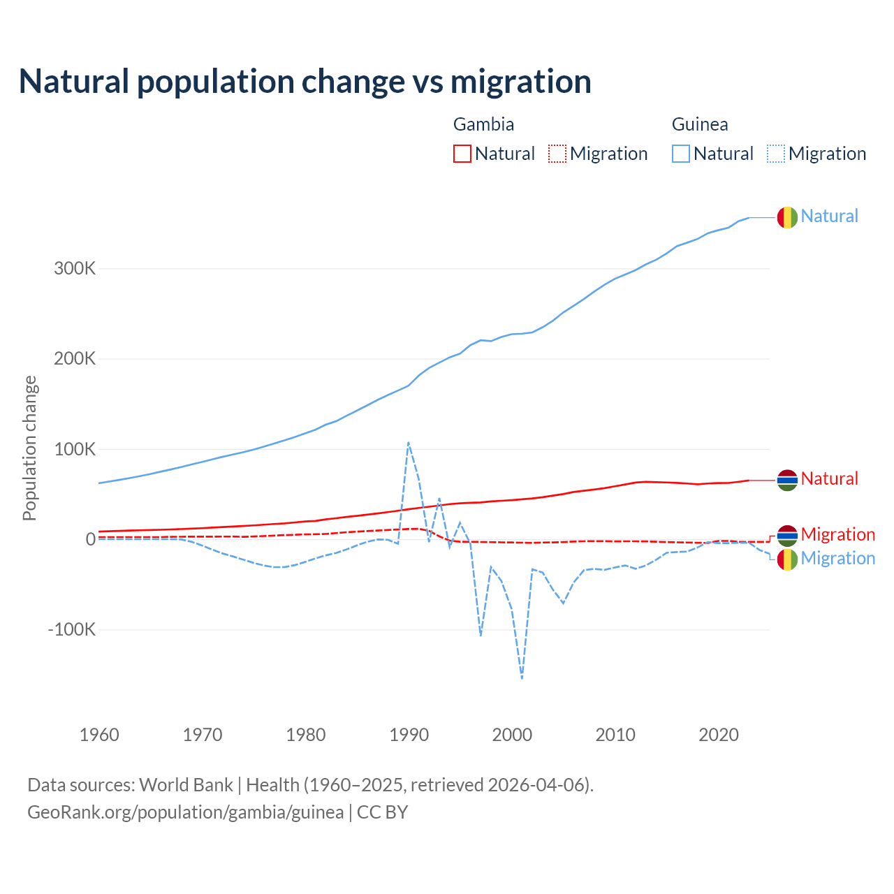 Over the last 10 years, 95.2% of the population change in the Gambia is from natural causes (a gain of 625,795 people) and 4.75% is from migration (a loss of 31,227 people). In Guinea 97.2% is from natural causes (a gain of 3,346,936 people) and 2.76% is from migration (a loss of 94,924 people).