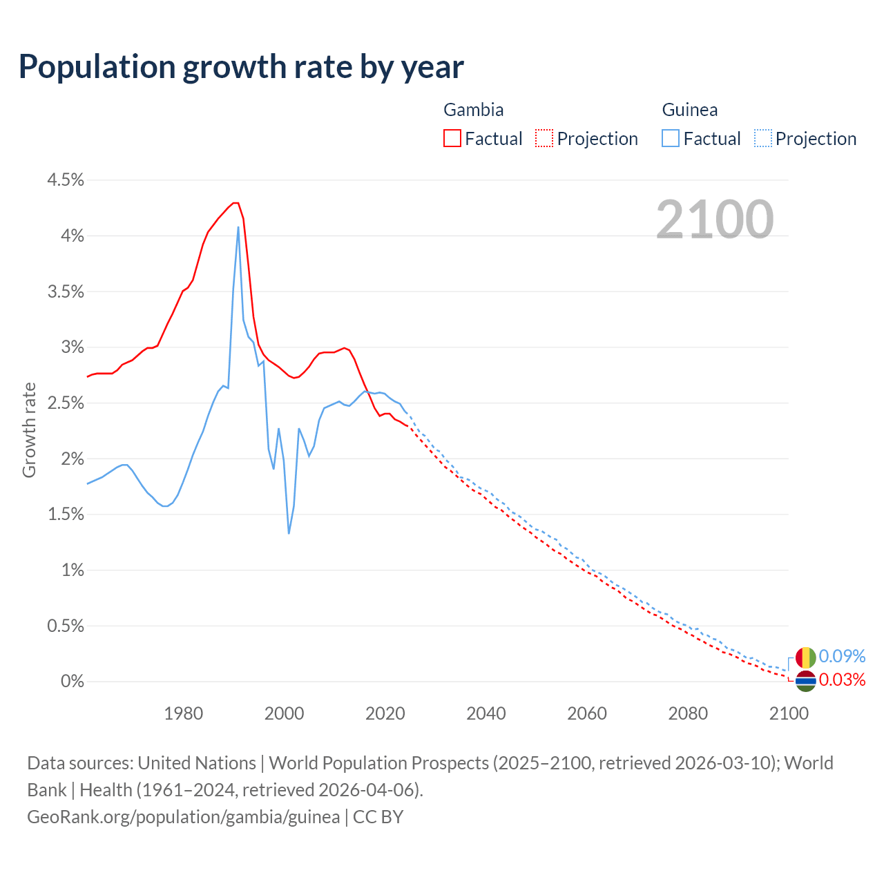 - For the last 10 years, the Gambia has had an average growth rate of +2.5% per year vs +2.54% in Guinea.