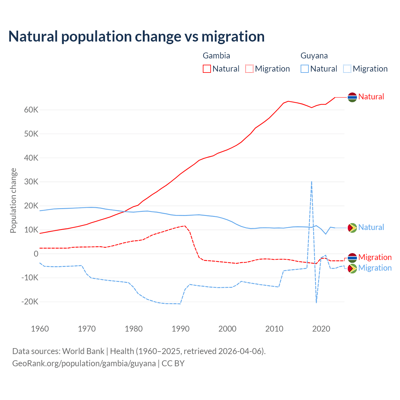 Over the last 10 years, 95.2% of the population change in the Gambia is from natural causes (a gain of 625,795 people) and 4.75% is from migration (a loss of 31,227 people). In Guyana 77.7% is from natural causes (a gain of 107,419 people) and 22.3% is from migration (a loss of 30,797 people).