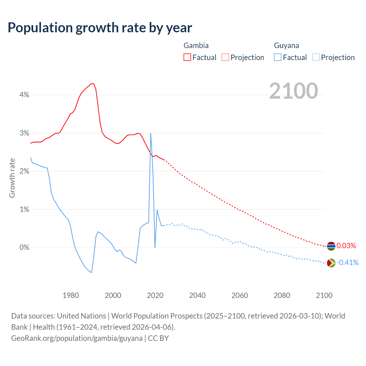 - For the last 10 years, the Gambia has had an average growth rate of +2.5% per year vs +0.94% in Guyana.