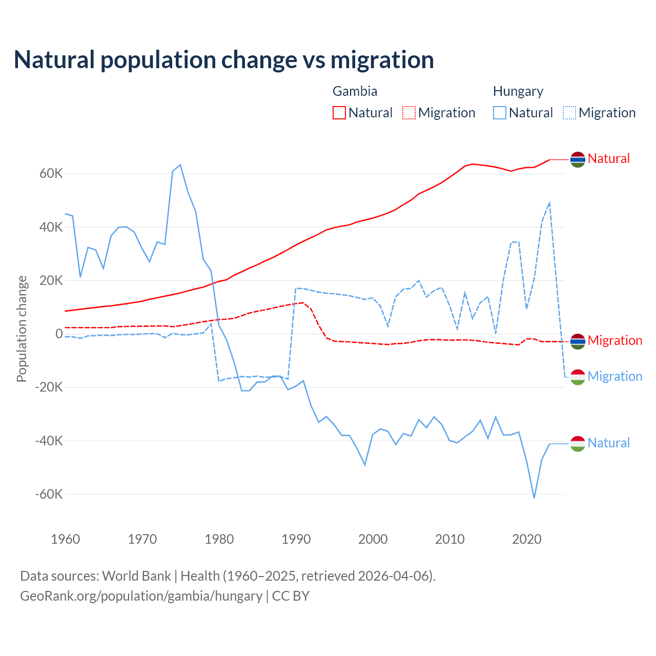 Over the last 10 years, 95.2% of the population change in the Gambia is from natural causes (a gain of 625,795 people) and 4.75% is from migration (a loss of 31,227 people). In Hungary 63.7% is from natural causes (a loss of 412,838 people) and 36.3% is from migration (a gain of 234,837 people).