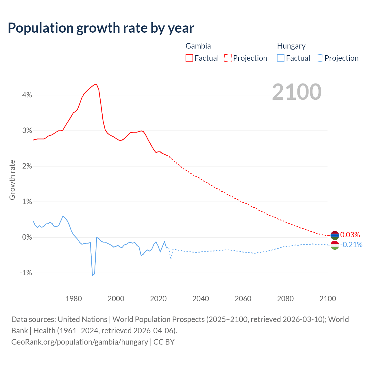 - For the last 10 years, the Gambia has had an average growth rate of +2.5% per year vs -0.29% in Hungary.