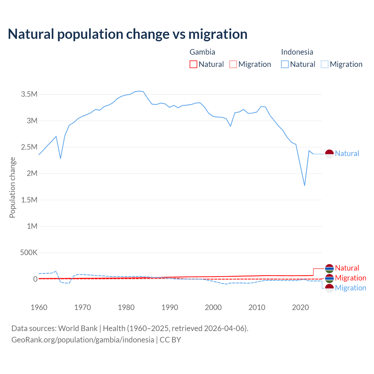 Over the last 10 years, 95.2% of the population change in the Gambia is from natural causes (a gain of 625,795 people) and 4.75% is from migration (a loss of 31,227 people). In Indonesia 98.9% is from natural causes (a gain of 25,242,860 people) and 1.1% is from migration (a loss of 280,258 people).