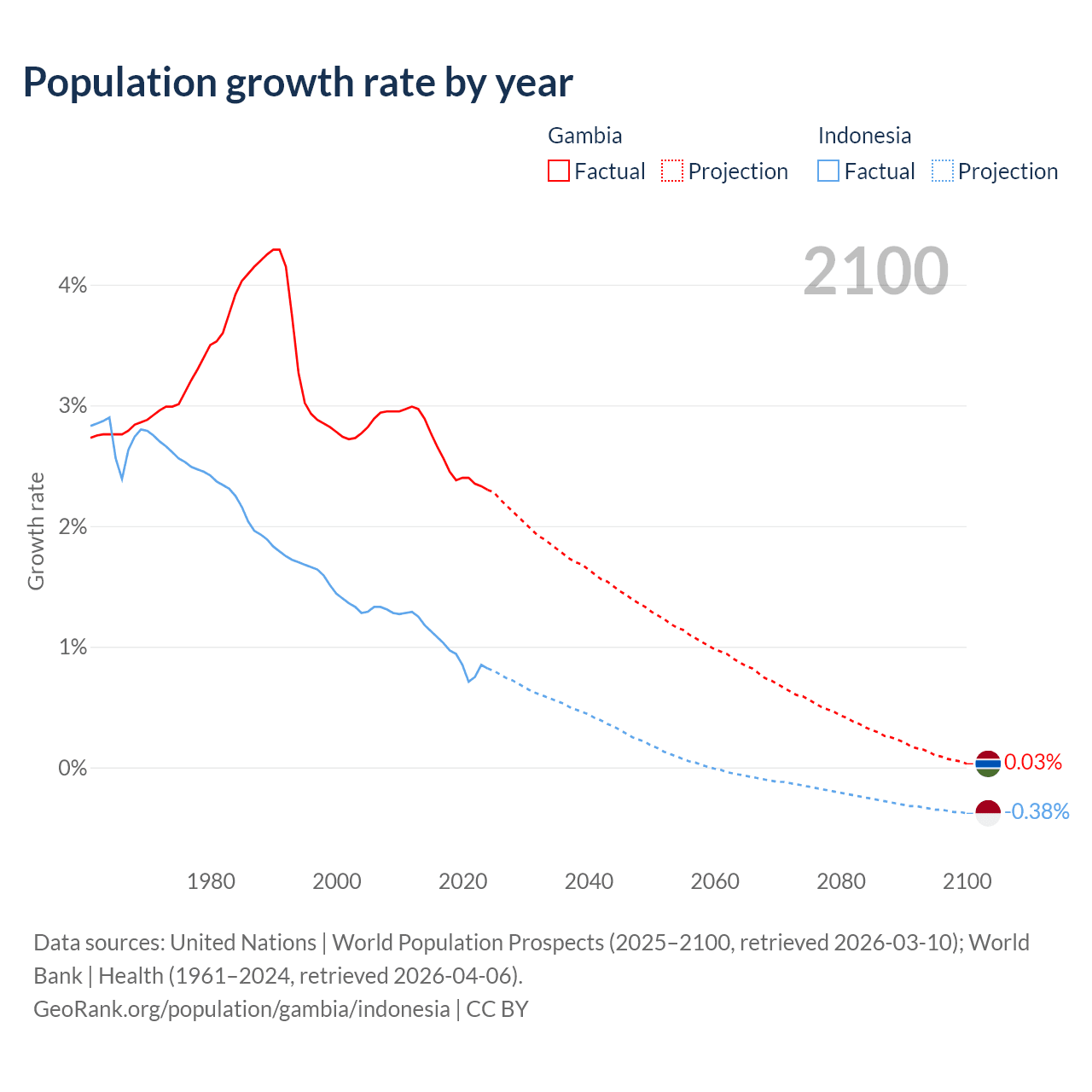 - For the last 10 years, the Gambia has had an average growth rate of +2.5% per year vs +0.94% in Indonesia.