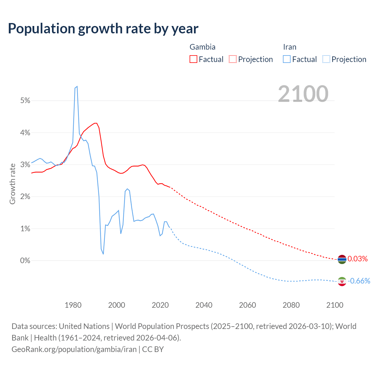 - For the last 10 years, the Gambia has had an average growth rate of +2.5% per year vs +1.19% in Iran.