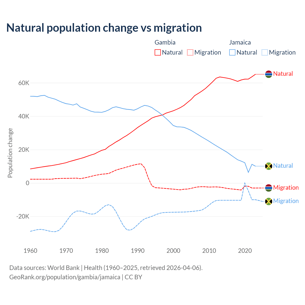 Over the last 10 years, 95.2% of the population change in the Gambia is from natural causes (a gain of 625,795 people) and 4.75% is from migration (a loss of 31,227 people). In Jamaica 61.3% is from natural causes (a gain of 137,465 people) and 38.7% is from migration (a loss of 86,681 people).