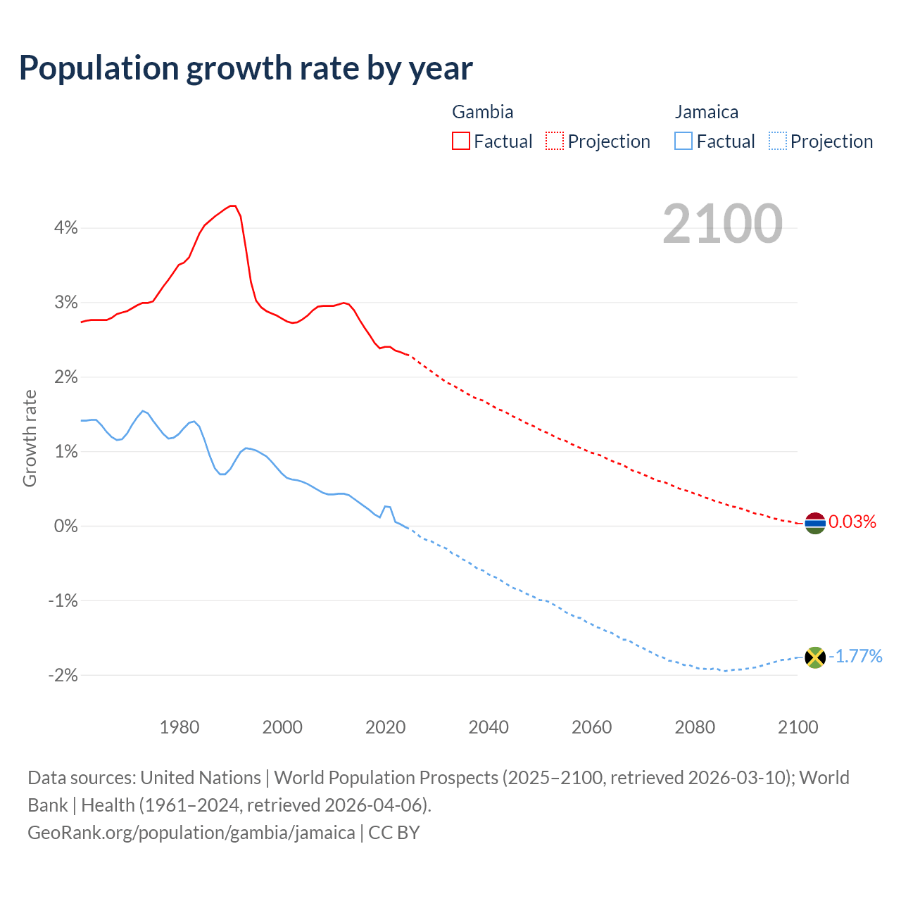 - For the last 10 years, the Gambia has had an average growth rate of +2.5% per year vs +0.18% in Jamaica.