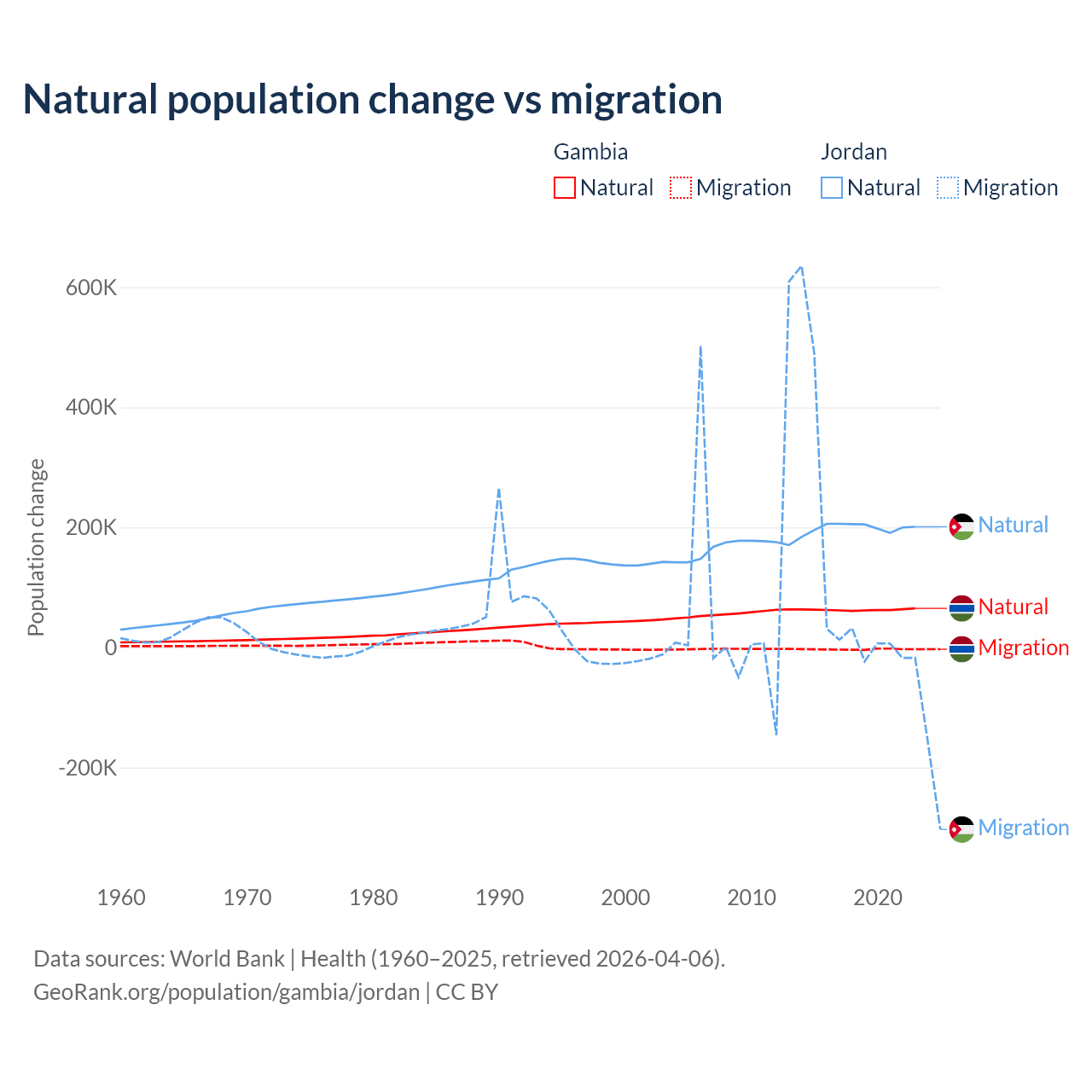 Over the last 10 years, 95.2% of the population change in the Gambia is from natural causes (a gain of 625,795 people) and 4.75% is from migration (a loss of 31,227 people). In Jordan 63.2% is from natural causes (a gain of 1,991,452 people) and 36.8% is from migration (a gain of 1,157,625 people).
