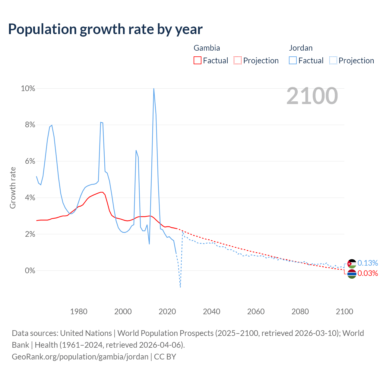 - For the last 10 years, the Gambia has had an average growth rate of +2.5% per year vs +3.45% in Jordan.