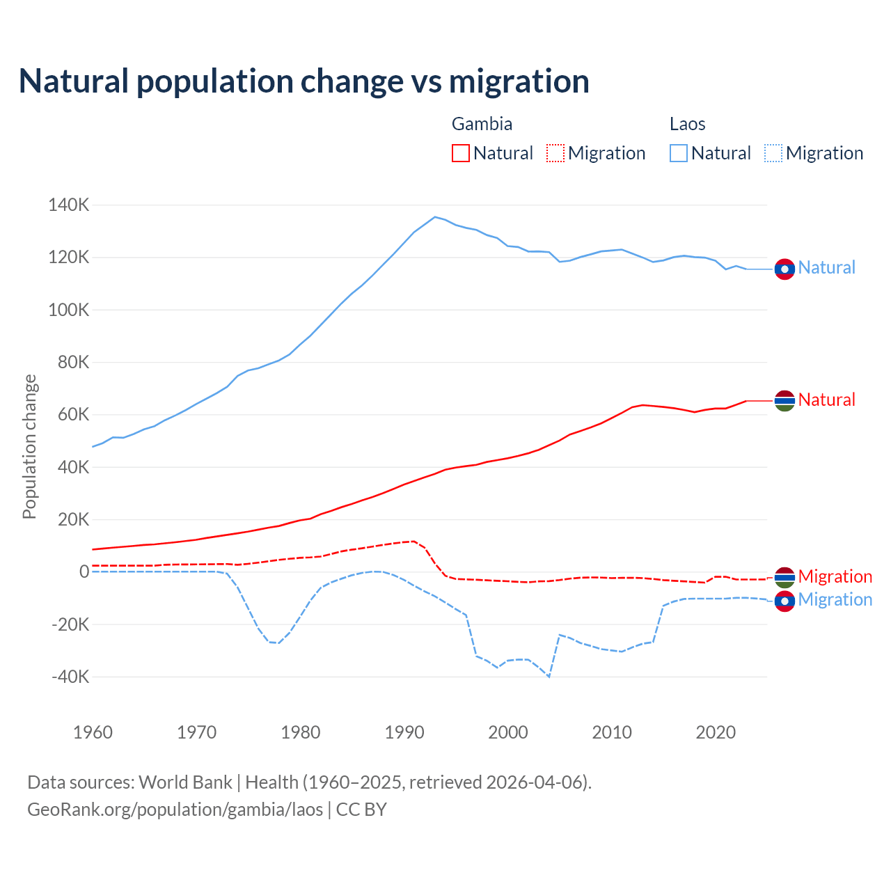 Over the last 10 years, 95.2% of the population change in the Gambia is from natural causes (a gain of 625,795 people) and 4.75% is from migration (a loss of 31,227 people). In Laos 90.6% is from natural causes (a gain of 1,183,013 people) and 9.41% is from migration (a loss of 122,899 people).