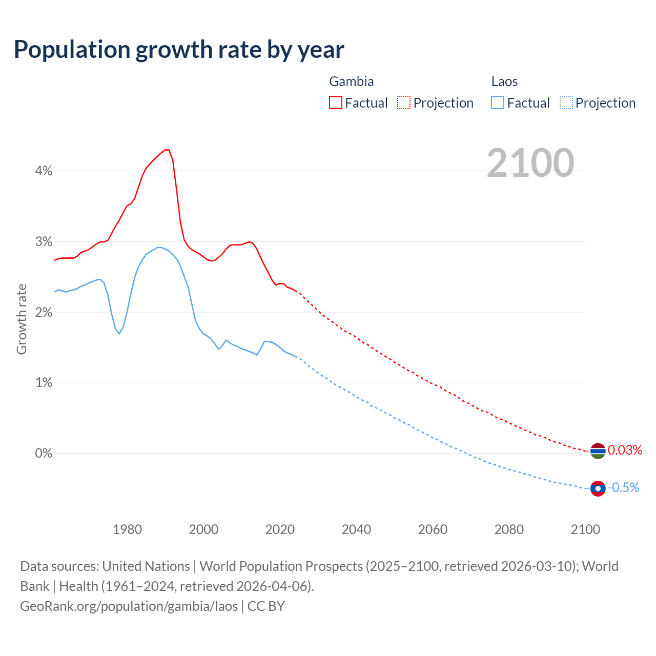- For the last 10 years, the Gambia has had an average growth rate of +2.5% per year vs +1.48% in Laos.