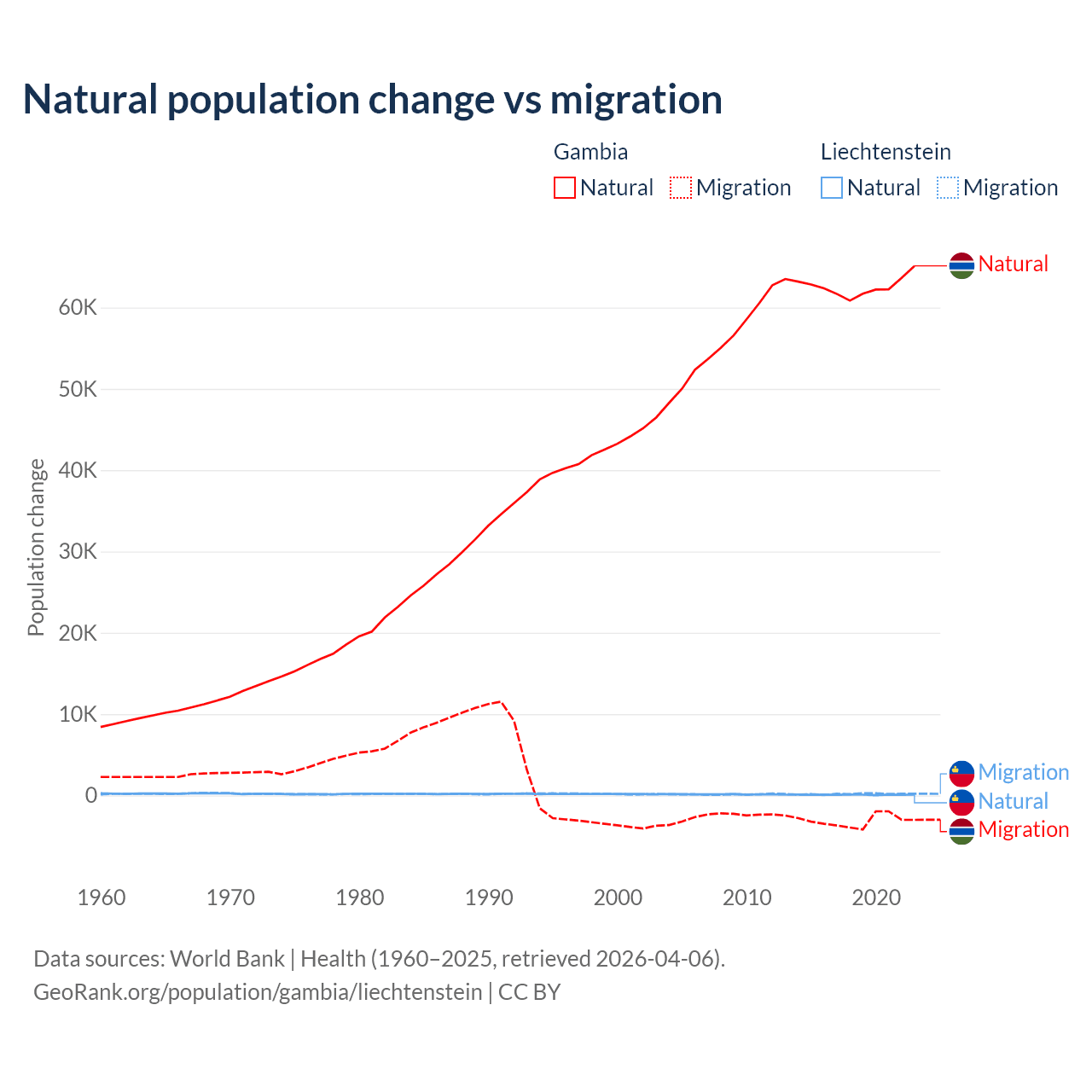 Over the last 10 years, 95.2% of the population change in the Gambia is from natural causes (a gain of 625,795 people) and 4.75% is from migration (a loss of 31,227 people). In Liechtenstein 32.4% is from natural causes (a gain of 883 people) and 67.6% is from migration (a gain of 1,843 people).