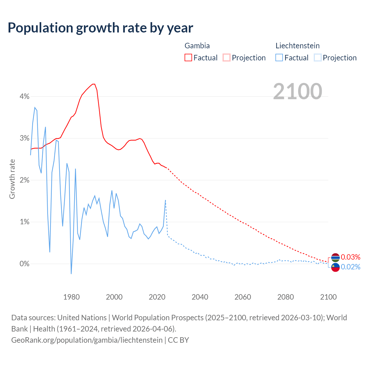 - For the last 10 years, the Gambia has had an average growth rate of +2.5% per year vs +0.82% in Liechtenstein.