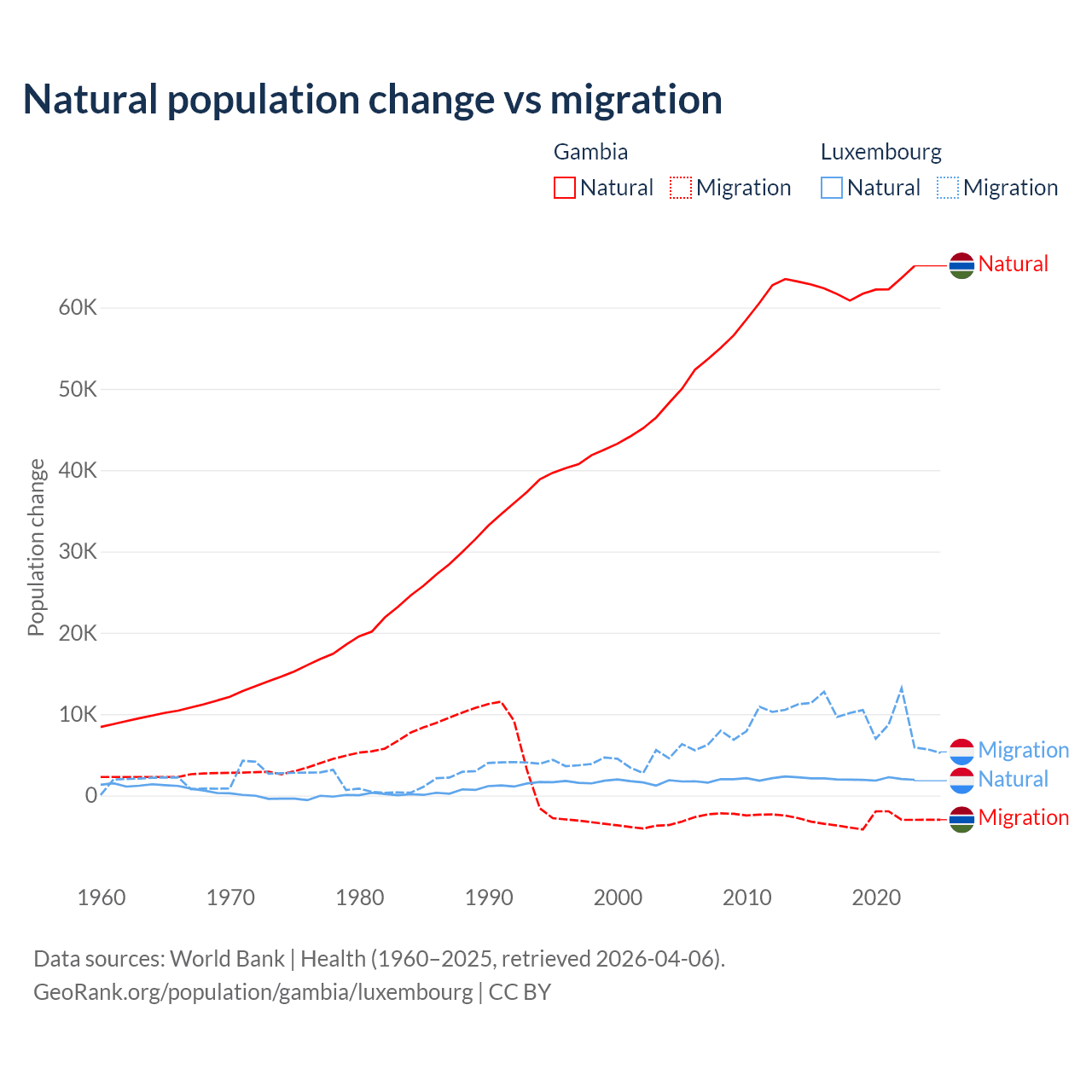 Over the last 10 years, 95.2% of the population change in the Gambia is from natural causes (a gain of 625,795 people) and 4.75% is from migration (a loss of 31,227 people). In Luxembourg 16.8% is from natural causes (a gain of 20,287 people) and 83.2% is from migration (a gain of 100,435 people).