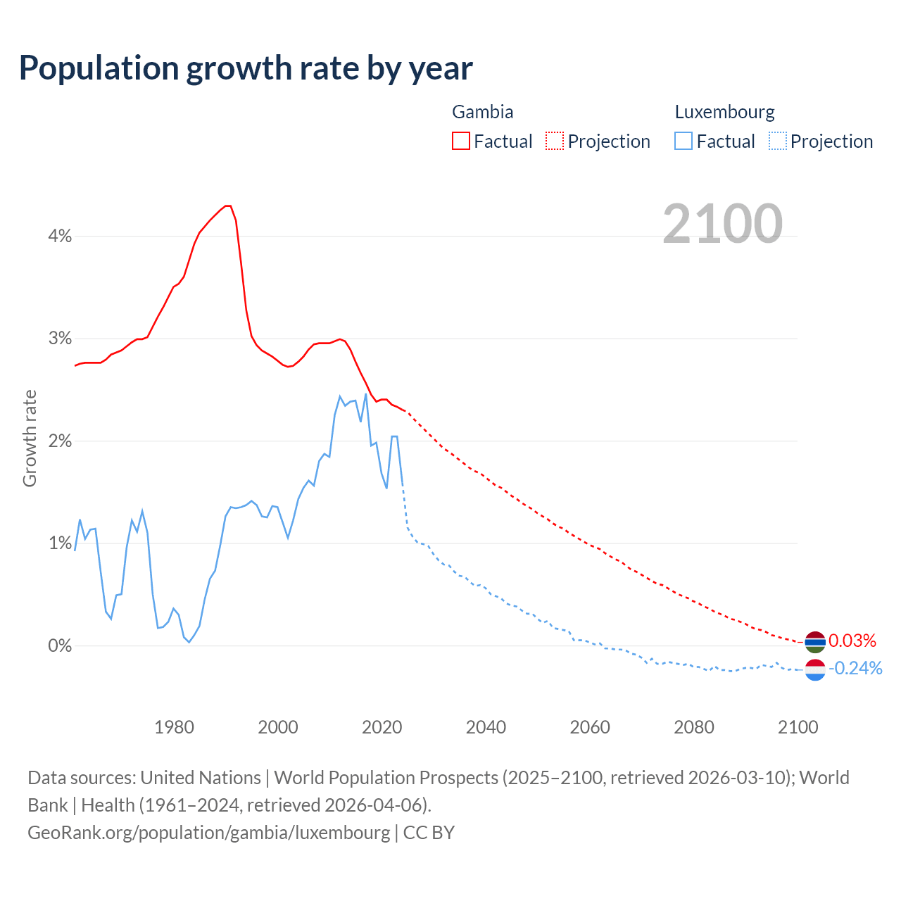 - For the last 10 years, the Gambia has had an average growth rate of +2.5% per year vs +2.02% in Luxembourg.