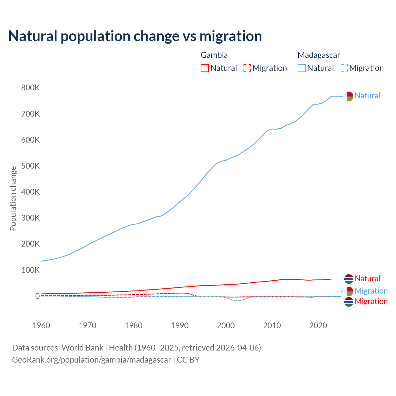 Over the last 10 years, 95.2% of the population change in the Gambia is from natural causes (a gain of 625,795 people) and 4.75% is from migration (a loss of 31,227 people). In Madagascar 99.7% is from natural causes (a gain of 7,165,578 people) and 0.31% is from migration (a loss of 22,384 people).