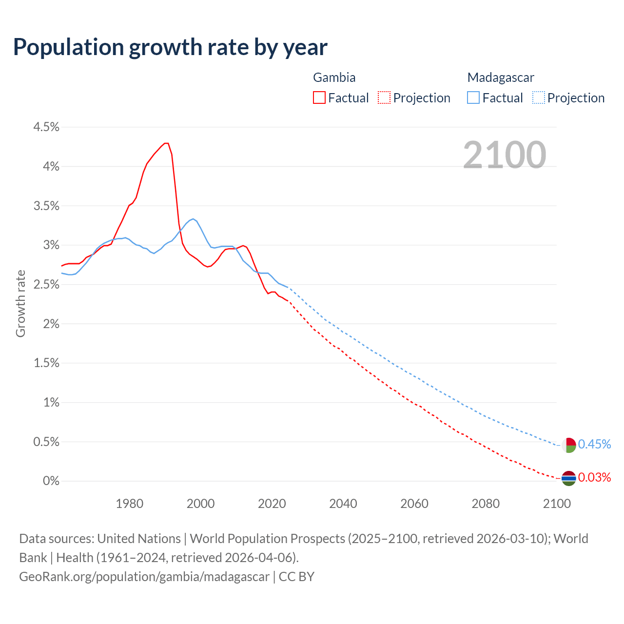 - For the last 10 years, the Gambia has had an average growth rate of +2.5% per year vs +2.6% in Madagascar.