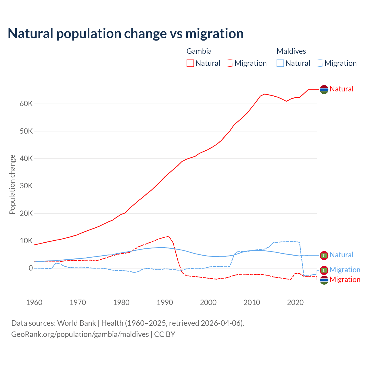 Over the last 10 years, 95.2% of the population change in the Gambia is from natural causes (a gain of 625,795 people) and 4.75% is from migration (a loss of 31,227 people). In Maldives 42.7% is from natural causes (a gain of 51,342 people) and 57.3% is from migration (a gain of 68,788 people).