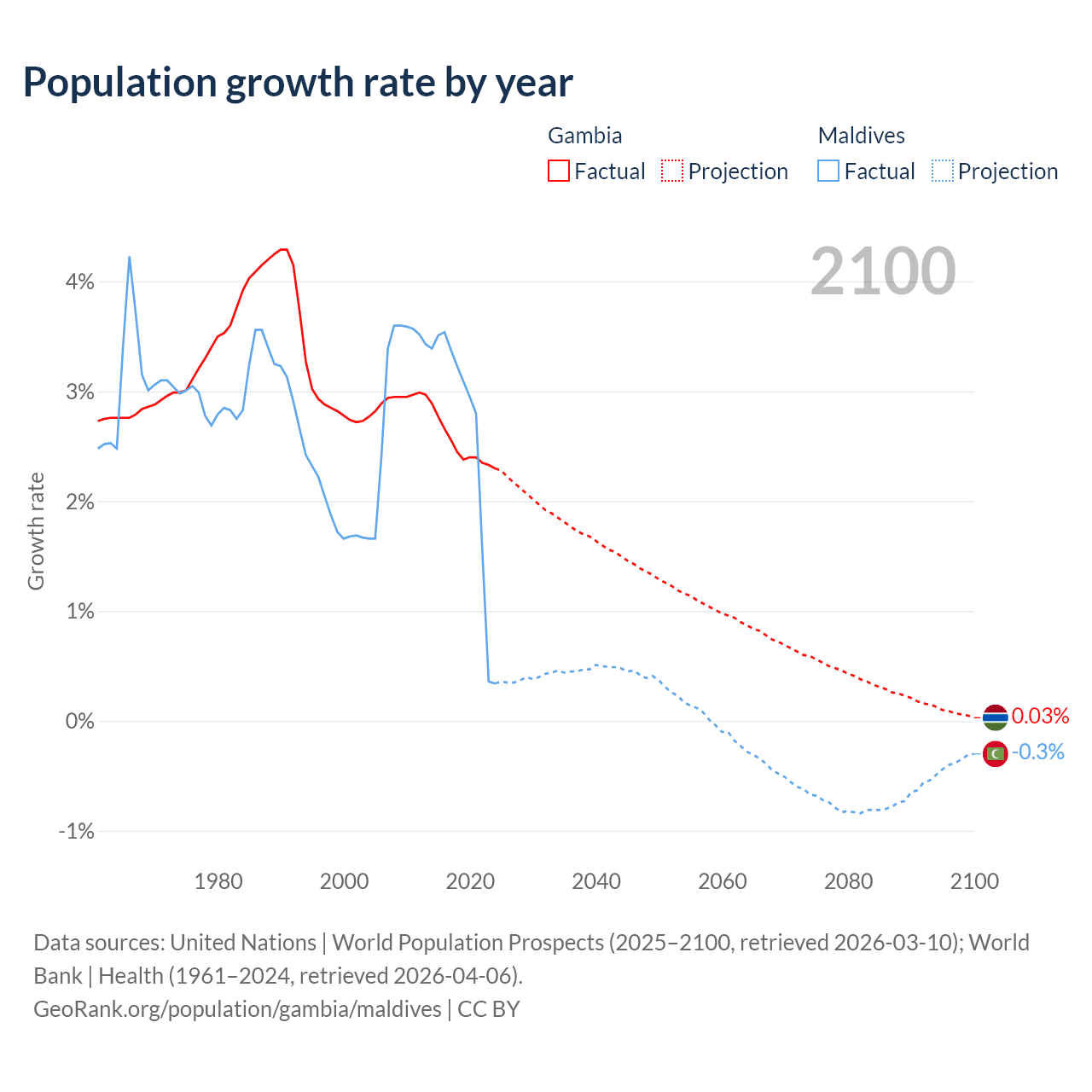 - For the last 10 years, the Gambia has had an average growth rate of +2.5% per year vs +2.56% in Maldives.