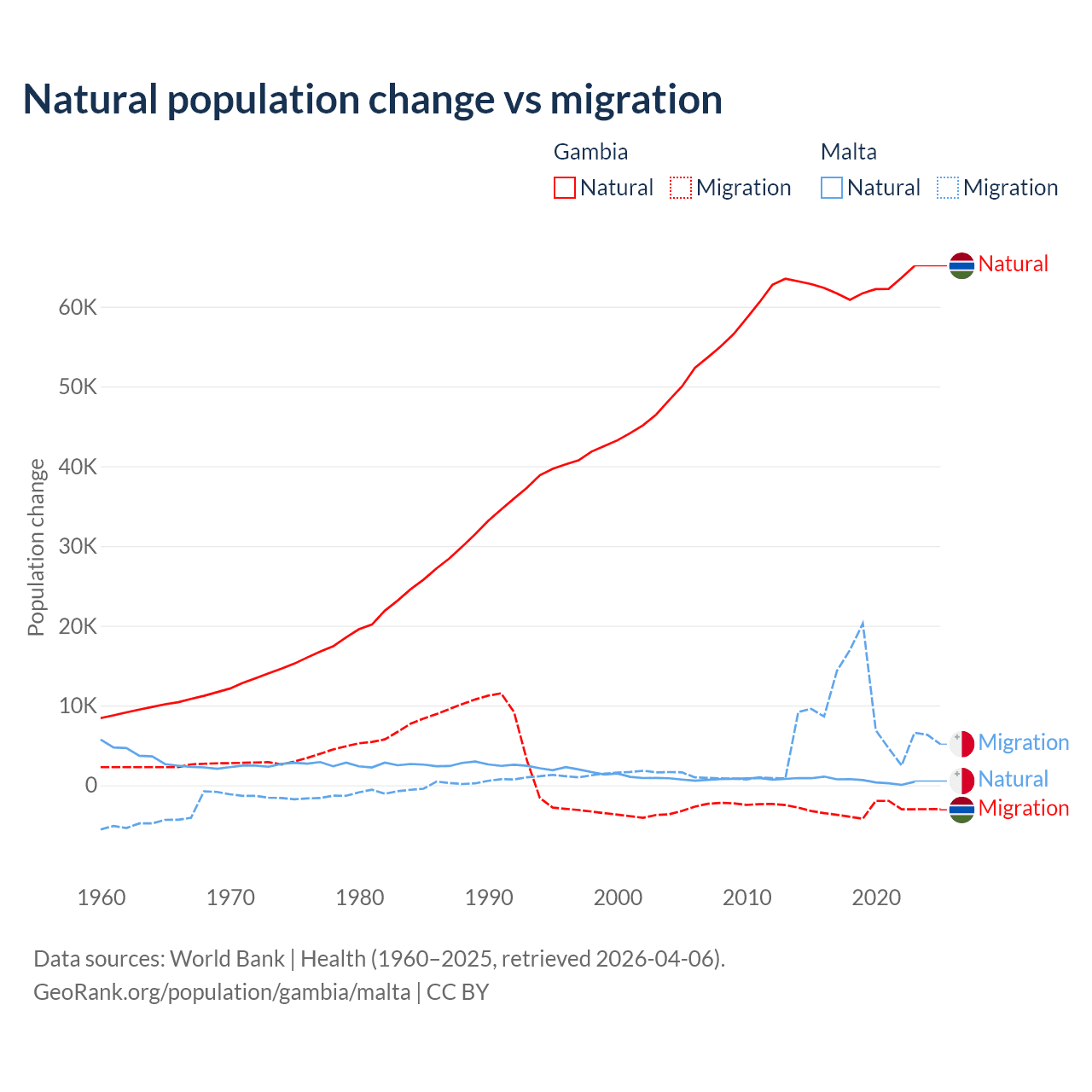 Over the last 10 years, 95.2% of the population change in the Gambia is from natural causes (a gain of 625,795 people) and 4.75% is from migration (a loss of 31,227 people). In Malta 5.84% is from natural causes (a gain of 6,181 people) and 94.2% is from migration (a gain of 99,652 people).