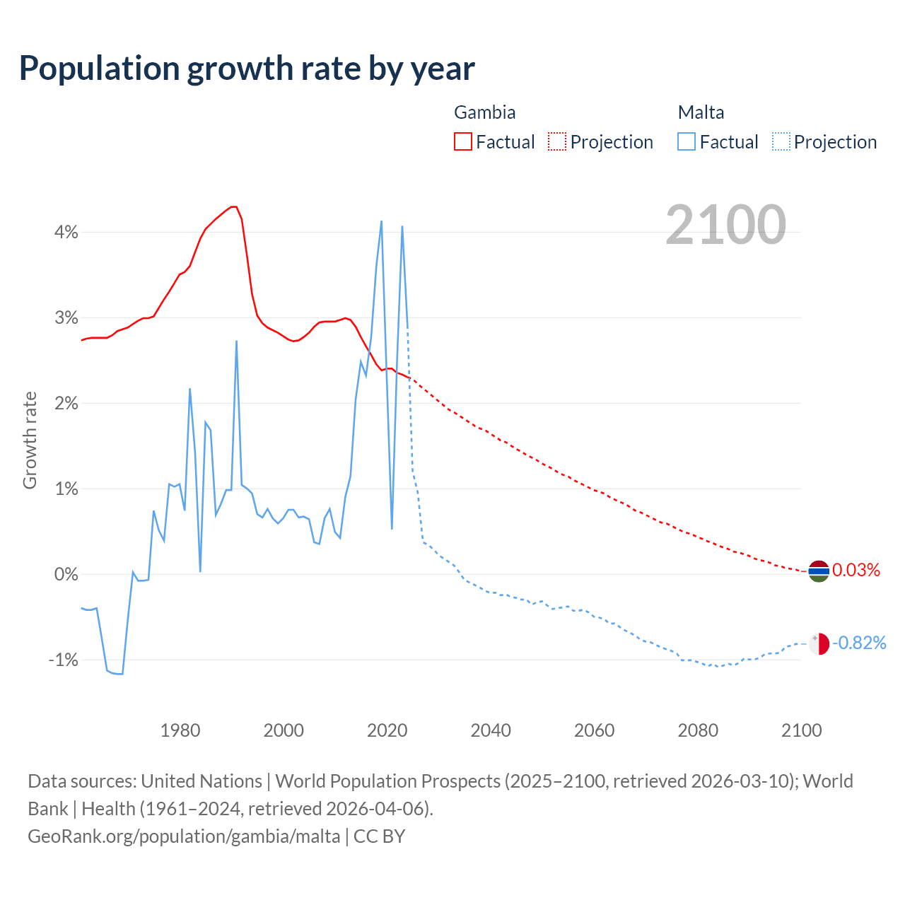 - For the last 10 years, the Gambia has had an average growth rate of +2.5% per year vs +2.69% in Malta.