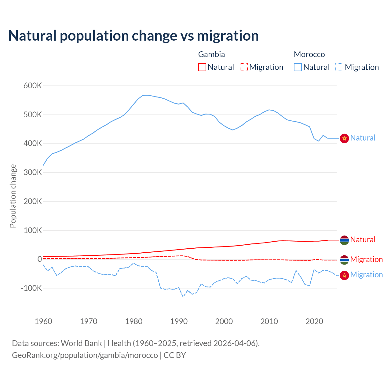 Over the last 10 years, 95.2% of the population change in the Gambia is from natural causes (a gain of 625,795 people) and 4.75% is from migration (a loss of 31,227 people). In Morocco 88.3% is from natural causes (a gain of 4,495,223 people) and 11.7% is from migration (a loss of 594,083 people).
