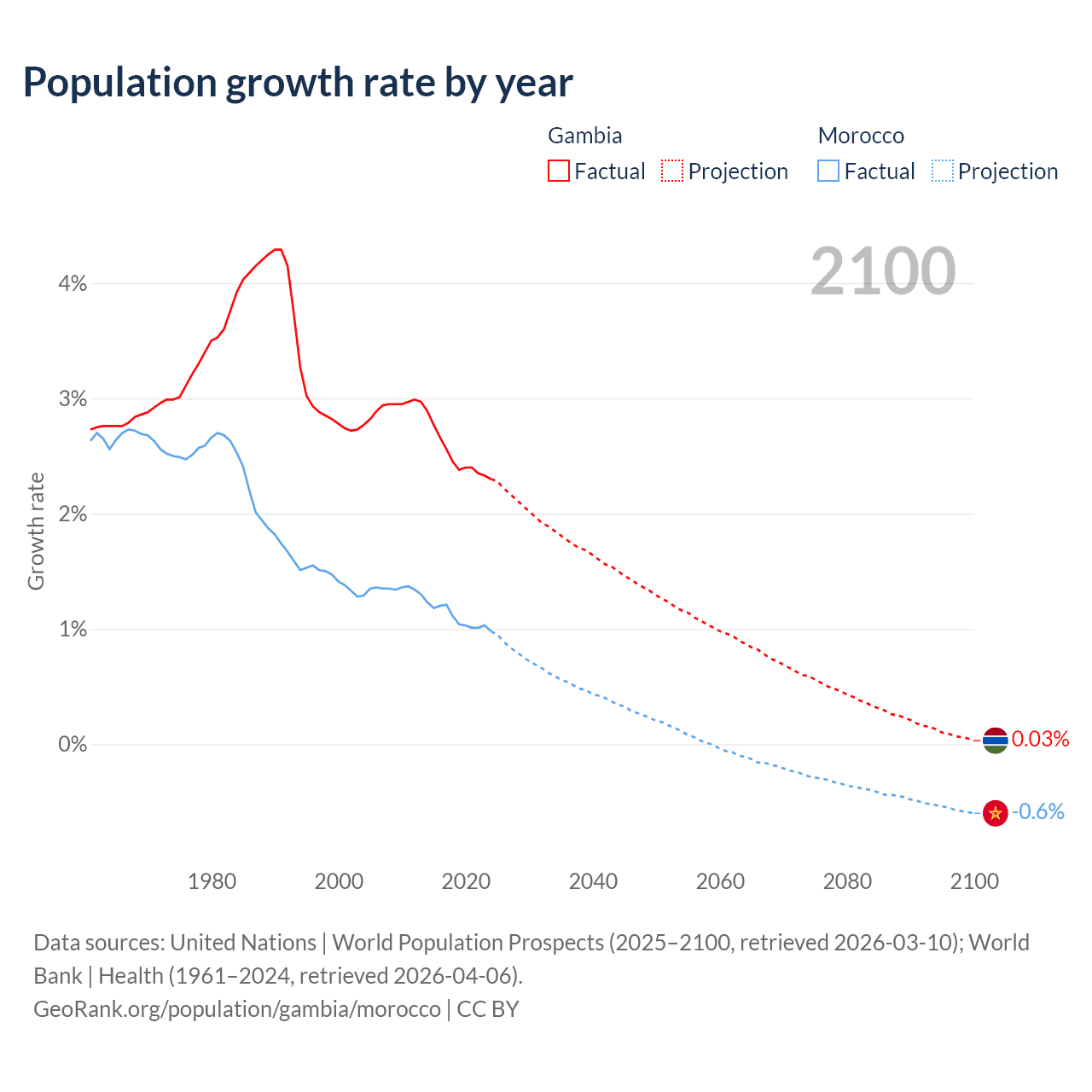 - For the last 10 years, the Gambia has had an average growth rate of +2.5% per year vs +1.09% in Morocco.