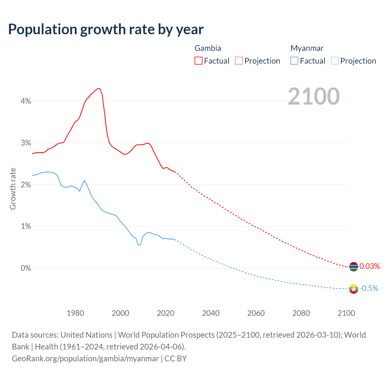 - For the last 10 years, the Gambia has had an average growth rate of +2.5% per year vs +0.74% in Myanmar.