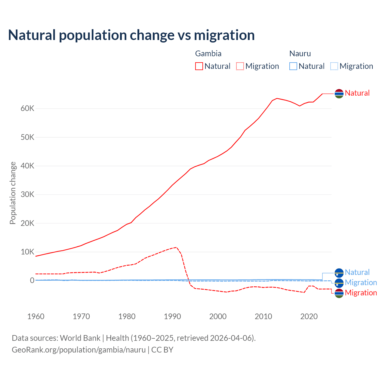 Over the last 10 years, 95.2% of the population change in the Gambia is from natural causes (a gain of 625,795 people) and 4.75% is from migration (a loss of 31,227 people). In Nauru 66.2% is from natural causes (a gain of 2,590 people) and 33.8% is from migration (a loss of 1,320 people).