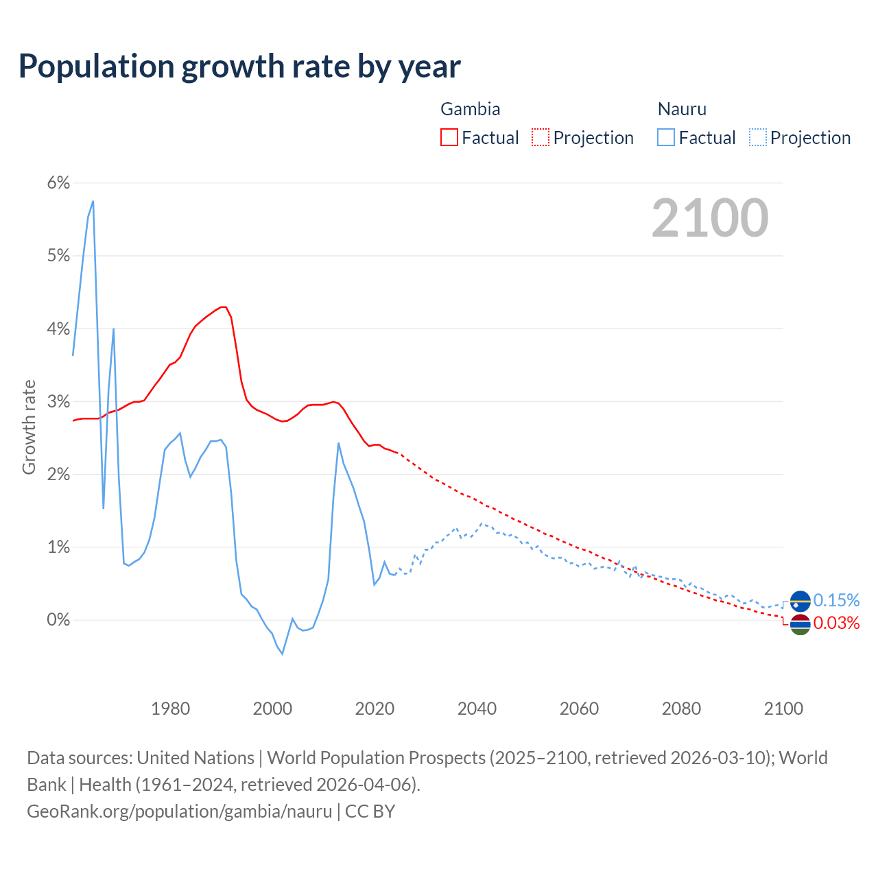 - For the last 10 years, the Gambia has had an average growth rate of +2.5% per year vs +1.17% in Nauru.