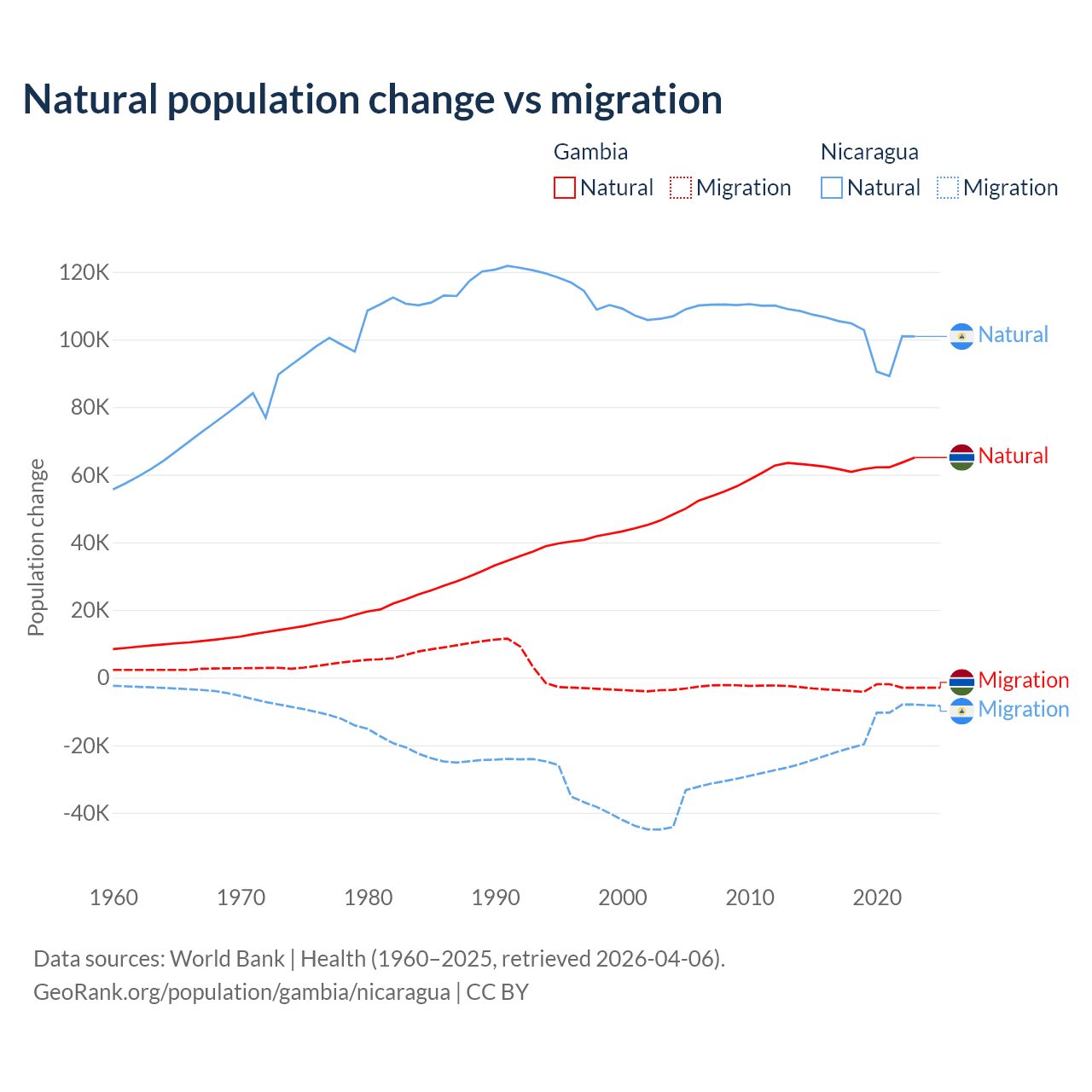 Over the last 10 years, 95.2% of the population change in the Gambia is from natural causes (a gain of 625,795 people) and 4.75% is from migration (a loss of 31,227 people). In Nicaragua 85.5% is from natural causes (a gain of 1,017,084 people) and 14.5% is from migration (a loss of 172,078 people).