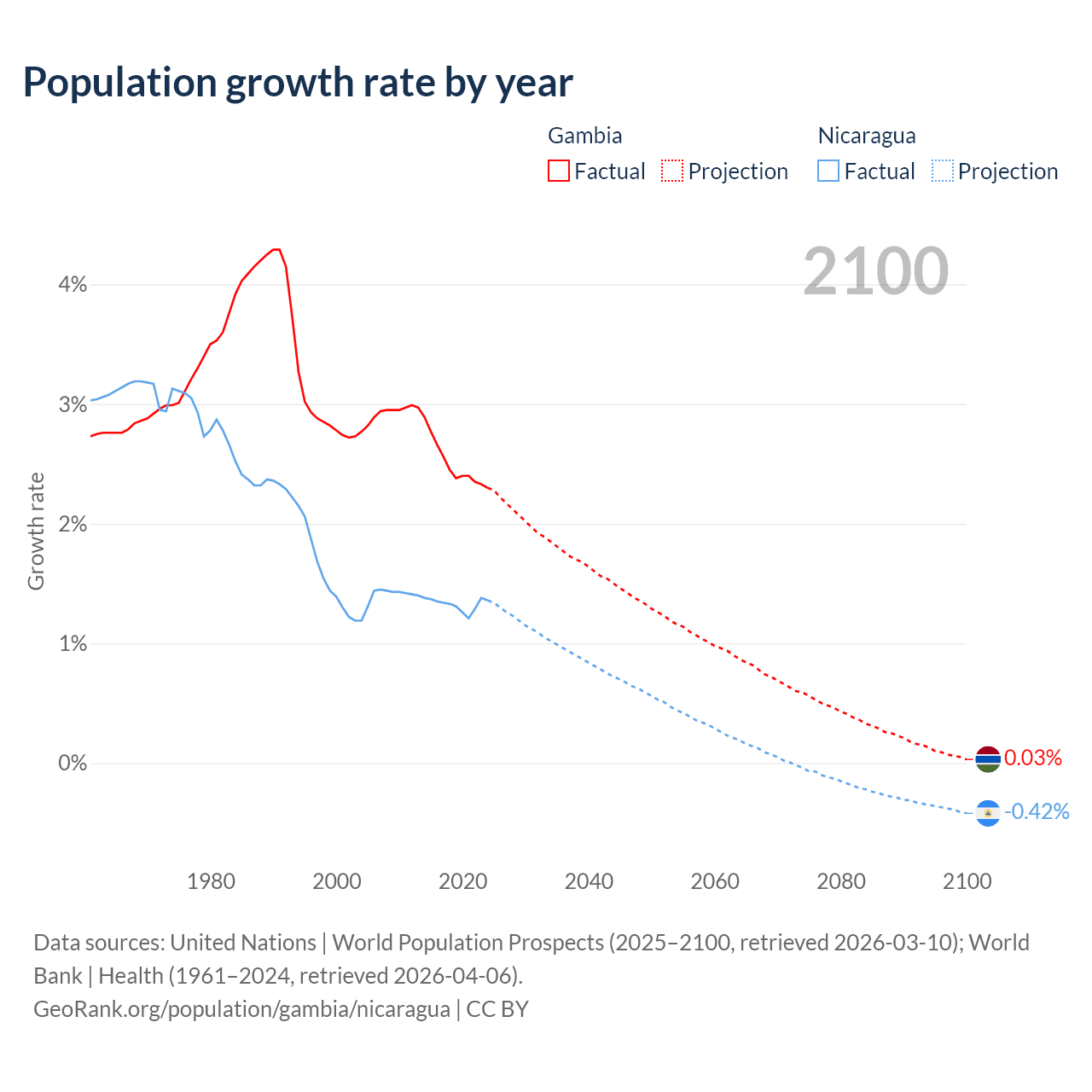- For the last 10 years, the Gambia has had an average growth rate of +2.5% per year vs +1.33% in Nicaragua.